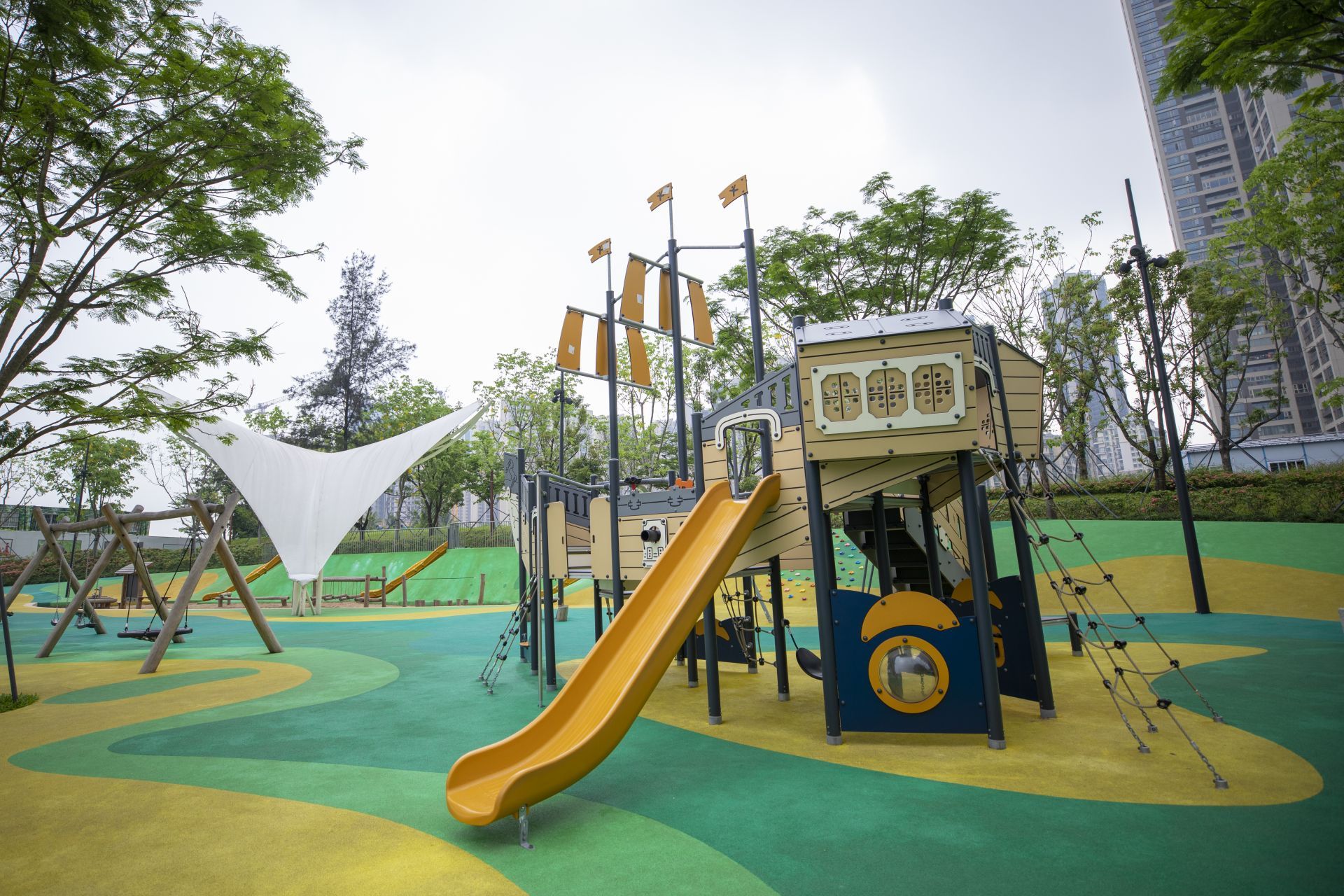 28日,記者從萬(wàn)象天地旁的沙河西路進(jìn)入位于大沙河生態(tài)長(zhǎng)廊中的大沖公園,這里設(shè)置了專門的兒童游樂(lè)區(qū),有三處長(zhǎng)短不一的趣味滑梯、沙池、海盜船、攀爬墻等設(shè)施。