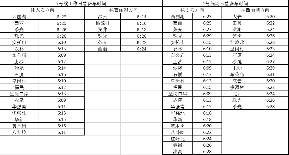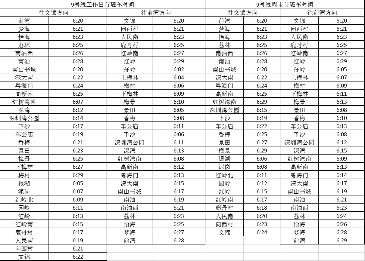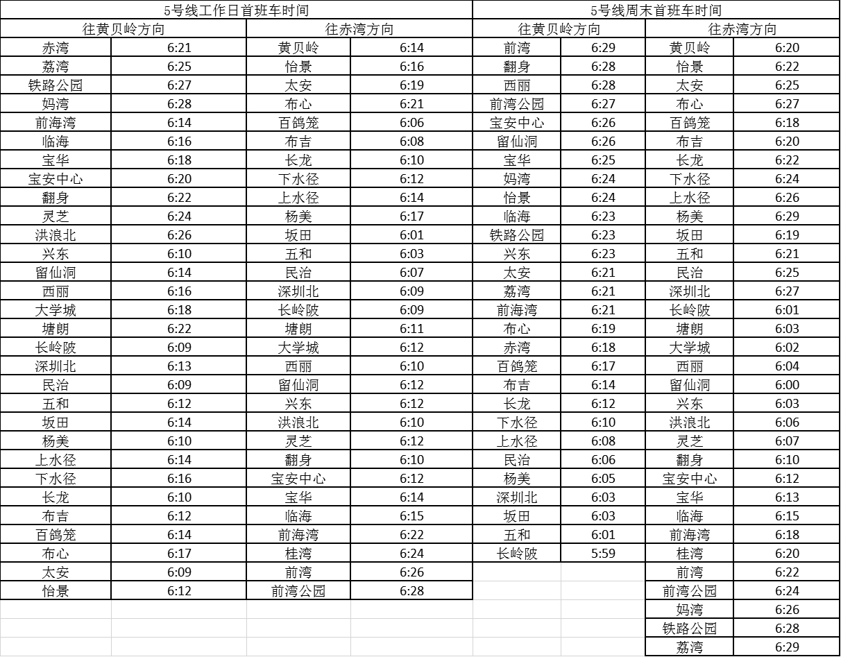 記者獲悉,經(jīng)優(yōu)化調(diào)整后,各線路工作日首班車最早發(fā)車站點及時間分別為,1號線老街站6:29、2號線蛇口港站6:14、3號線塘坑站6:05、5號線坂田站6:01、7號線赤尾6:09、9號線銀湖6:05、11號線機場站6:04。周末期間首班車最早發(fā)車站點及時間分別為,2號線香梅北站6:07、3號線塘坑站6:04、5號線長嶺陂站6:00、7號線皇崗口岸站6:09、9號線孖嶺站6:05、11號線機場站6:03。