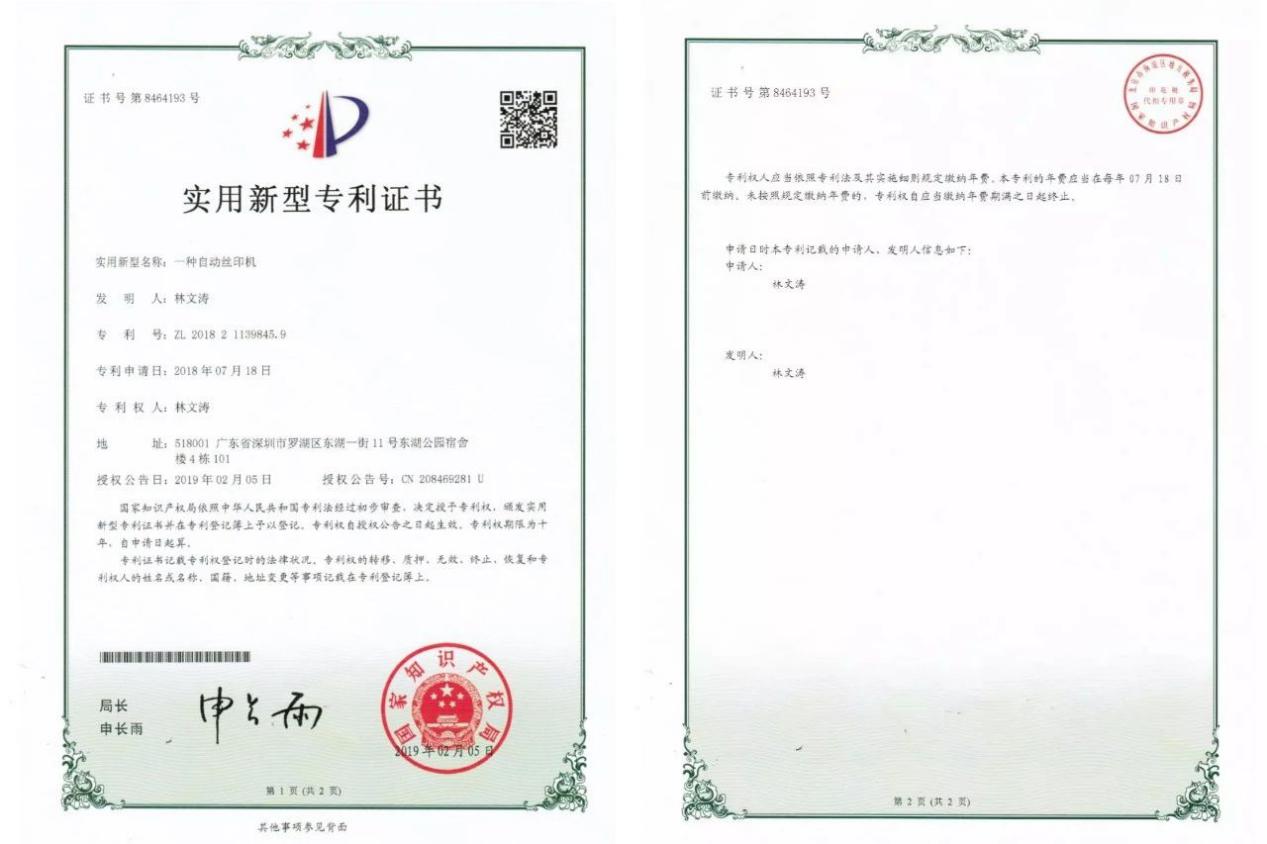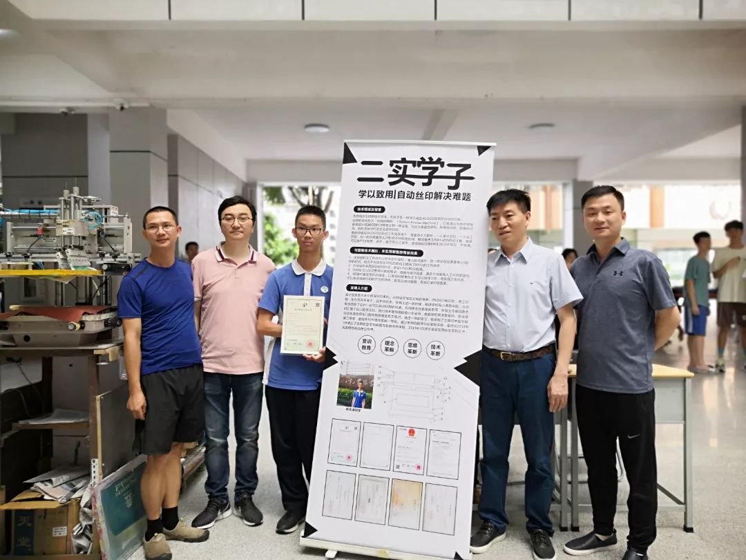 2019年12月,林文濤參加中國科協舉行的“全國青少年科技創(chuàng)新大賽”,獲得深圳市二等獎。他發(fā)明的成品雨傘自動絲印機,榮獲實用新型專利證書。這種自動絲印機,極大地提高了工作效率,在一把雨傘上印刷一個logo僅僅需要單人5秒的時間。