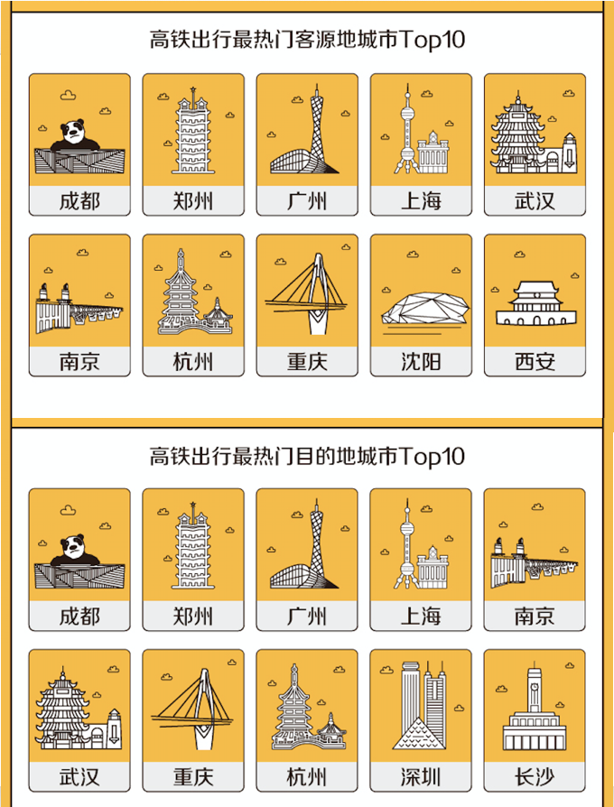 除此之外,城市周邊高鐵短途游受歡迎,特別是2小時(shí)內(nèi)的高鐵行程受到家庭出游的青睞。比如,上海開(kāi)往杭州、蘇州、南京;廣州開(kāi)往深圳、東莞、珠海;成都開(kāi)往重慶、綿陽(yáng)、眉山;武漢開(kāi)往孝感、襄陽(yáng)、黃石等城市短途高鐵線路預(yù)定量排名靠前。