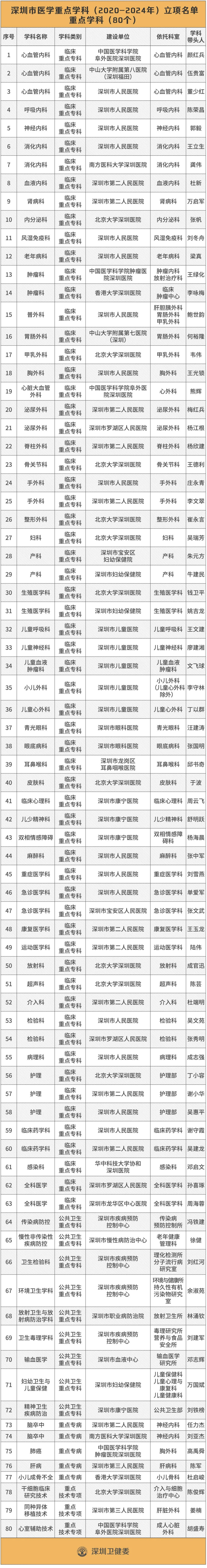 6月19日,深圳市衛(wèi)健委公布了2020-2024年的深圳市醫(yī)學(xué)重點(diǎn)學(xué)科立項(xiàng)名單,包括80個(gè)重點(diǎn)學(xué)科、15個(gè)重點(diǎn)培育學(xué)科。此外,深圳還有24個(gè)專科入選“省重點(diǎn)”名單,其中13個(gè)是國(guó)家衛(wèi)健委或國(guó)家中醫(yī)藥管理局認(rèn)定的國(guó)家級(jí)臨床重點(diǎn)??啤_@份名單是2019年由廣東省衛(wèi)健委公布的“廣東省高水平臨床重點(diǎn)??啤泵麊?。