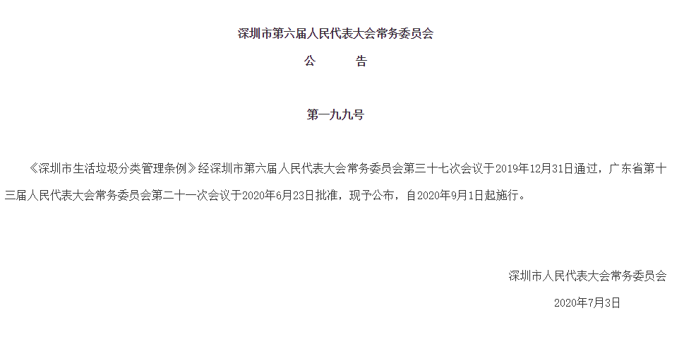 見圳客戶端·深圳新聞網(wǎng)2020年7月4日訊(見圳客戶端、深圳新聞網(wǎng)記者 葉梅)記者從深圳市人大常委會(huì)官方網(wǎng)站獲悉,《深圳市生活垃圾分類管理?xiàng)l例》(以下簡(jiǎn)稱《條例》)經(jīng)深圳市第六屆人民代表大會(huì)常務(wù)委員會(huì)第三十七次會(huì)議于2019年12月31日通過(guò),廣東省第十三屆人民代表大會(huì)常務(wù)委員會(huì)第二十一次會(huì)議于2020年6月23日批準(zhǔn),將于2020年9月1日起施行,從垃圾分類投放、收集運(yùn)輸處理、源頭減量和循環(huán)利用等方面提出了明確要求。