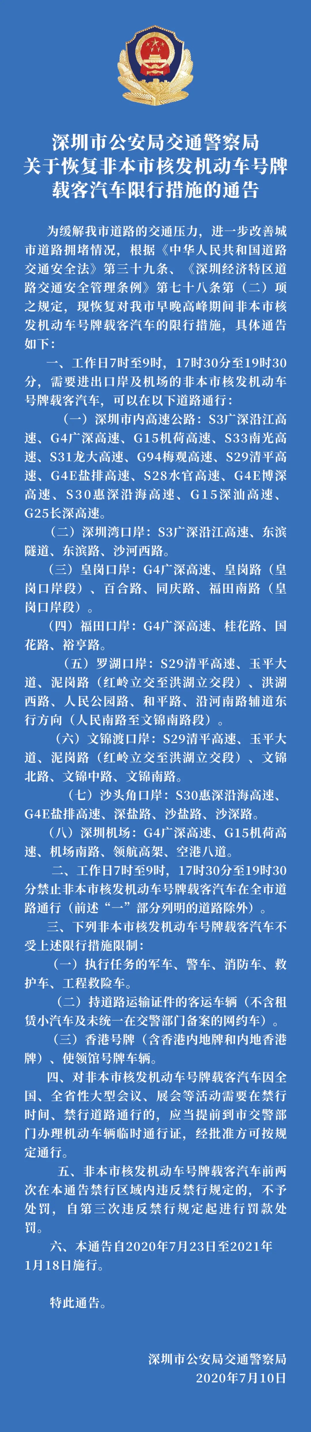 見圳客戶端?深圳新聞網(wǎng)2020年7月15日訊(見圳客戶端、深圳新聞網(wǎng)記者 張喆 陳彥如 實(shí)習(xí)生 廖章霖)7月15日,記者從深圳市交警支隊(duì)了解到,7月23日開始深圳將恢復(fù)“限外令”,對非深號牌小型載客汽車恢復(fù)限行。本次“限外令”與此前保持一致,除全市高速公路和部分疏港通道不限行以外,全市所有道路在早7:00-9:00和晚17:30-19:30高峰時(shí)段對所有非深圳號牌載客汽車實(shí)施限行。