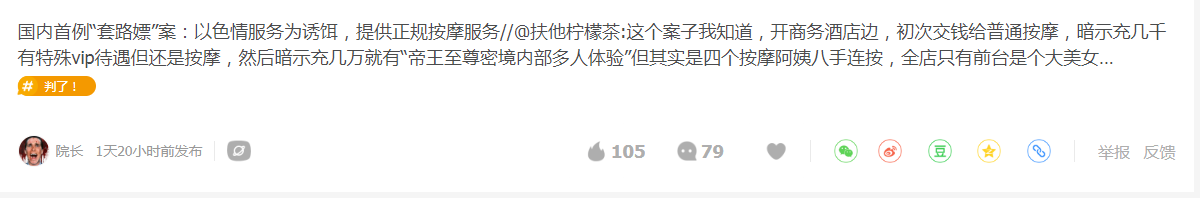 據(jù)報道,浙江一家SPA俊顏館初次交錢有普通按摩,暗示客戶充值有特殊服務(wù),實際上是高級一點的按摩,再暗示充幾萬可享受“帝王至尊密境內(nèi)部多人體驗”,其實就是四個按摩阿姨八手連按。