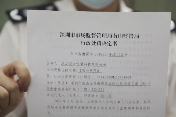 經(jīng)過近2個月的調(diào)查,7月21日,深圳悅來悅愛科技有限公司正式簽收深圳市市場監(jiān)督管理局南山分局粵海所開出的行政處罰決定書,罰款2000元。