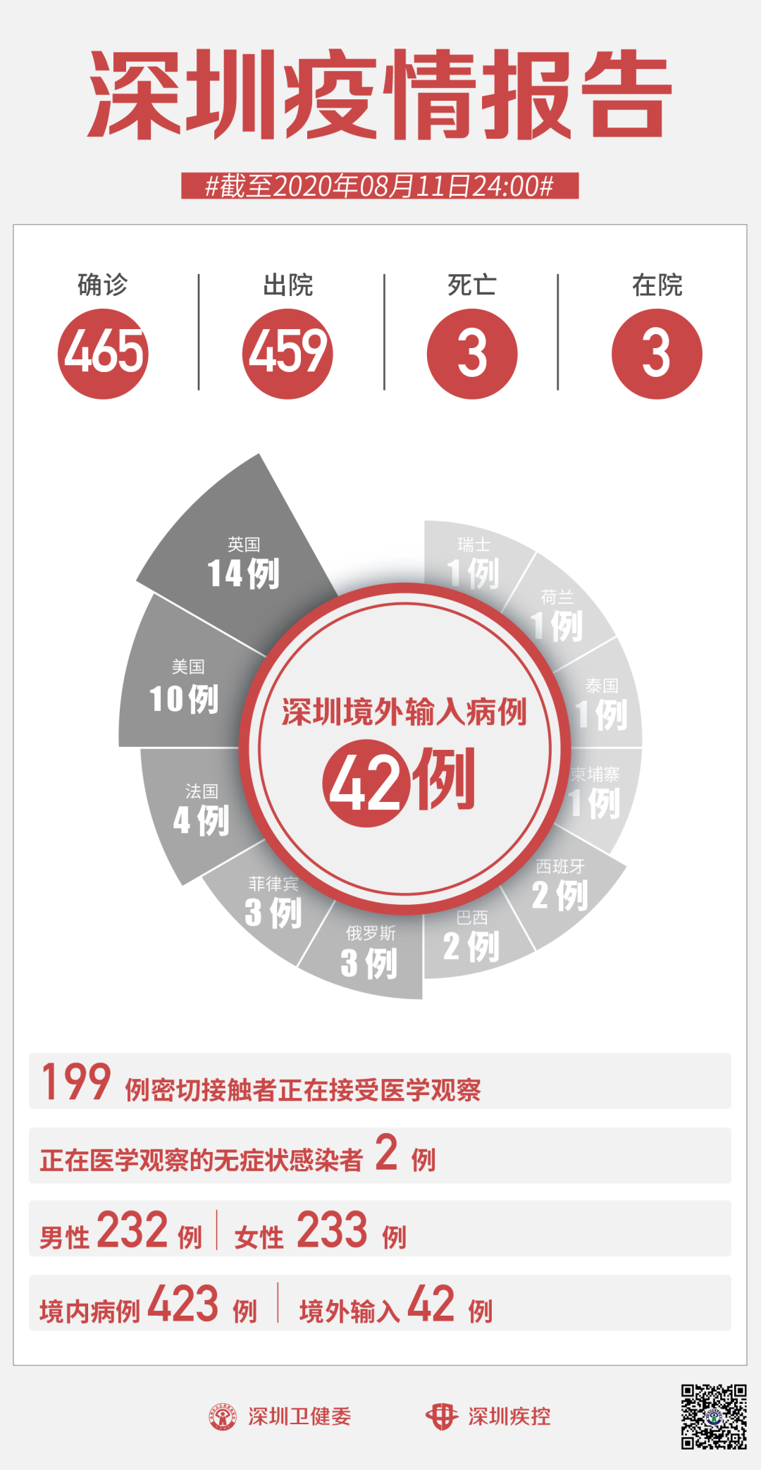 截至8月11日24時(shí),深圳市累計(jì)報(bào)告新冠肺炎確診病例465例。目前在院3例。