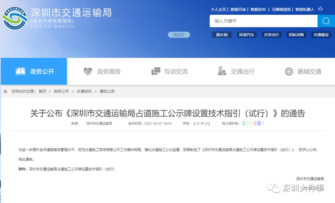 為加強道路管理,規(guī)范道路占用、挖掘行為,強化占道施工公眾監(jiān)督,深圳市交通運輸局編制了《占道施工公示牌設(shè)置技術(shù)指引(試行)》(以下簡稱《指引》),對占道施工公示牌設(shè)置要求,張貼范圍都有了明確的標(biāo)準(zhǔn)和要求。