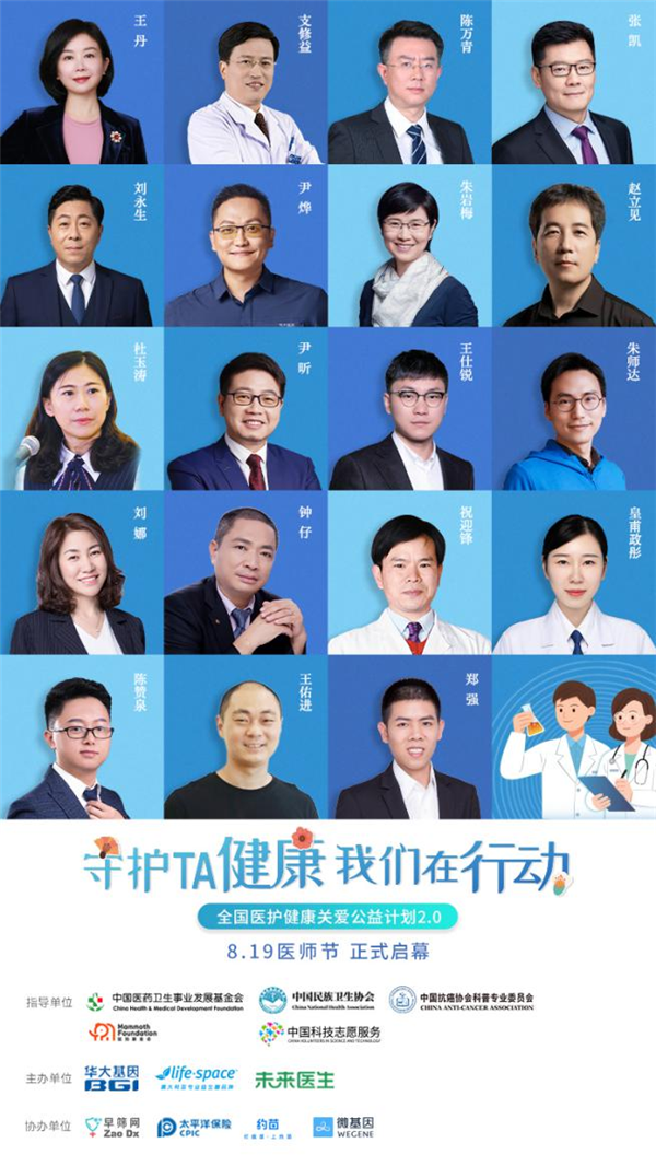 此次公益由中國(guó)醫(yī)藥衛(wèi)生事業(yè)發(fā)展基金會(huì)、中國(guó)民族衛(wèi)生協(xié)會(huì)、中國(guó)抗癌協(xié)會(huì)科普專(zhuān)業(yè)委員會(huì)、深圳猛犸公益基金會(huì)等機(jī)構(gòu)指導(dǎo),華大基因、Life-Space、未來(lái)醫(yī)生聯(lián)合主辦,早篩網(wǎng)、太平洋保險(xiǎn)、約苗、微基因協(xié)辦,通過(guò)健康關(guān)懷禮包捐贈(zèng)、公益科普直播、線上義診等系列活動(dòng),呼吁全社會(huì)關(guān)愛(ài)醫(yī)護(hù)人員,助力全社會(huì)形成“尊醫(yī)重衛(wèi)”的文化和氛圍;同時(shí)借助公益影響力,讓關(guān)愛(ài)輻射更廣泛人群,提高全民“早篩、早診、早治”的健康意識(shí),助力健康中國(guó)。