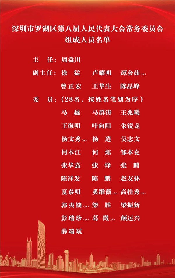 經(jīng)會(huì)議選舉,周益川當(dāng)選羅湖區(qū)第八屆人大常委會(huì)主任,范德繁當(dāng)選羅湖區(qū)人民政府區(qū)長(zhǎng),姚文勝當(dāng)選羅湖區(qū)監(jiān)察委員會(huì)主任。徐猛、盧耀明、譚會(huì)茹、曾正宏、王華生、陳磊峰當(dāng)選羅湖區(qū)第八屆人大常委會(huì)副主任。左金平、夏東、于紅軍、馮健、肖嘉睿、詹輝、霍廣勇當(dāng)選羅湖區(qū)人民政府副區(qū)長(zhǎng)。楊爽當(dāng)選羅湖區(qū)人民法院院長(zhǎng)。張彬當(dāng)選羅湖區(qū)人民檢察院檢察長(zhǎng),根據(jù)法律規(guī)定,須報(bào)經(jīng)市人民檢察院檢察長(zhǎng)提請(qǐng)市人大常委會(huì)批準(zhǔn)。獲頒當(dāng)選證書后,新當(dāng)選人員向憲法宣誓就職。