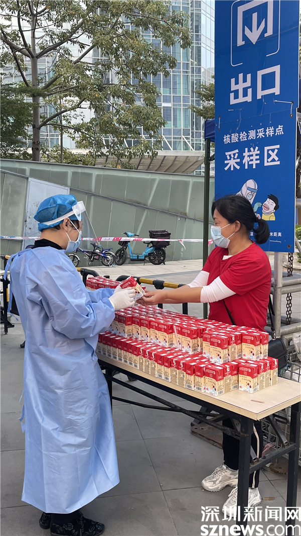 在筍崗街道初心公園核酸檢測點(diǎn),市民在進(jìn)行核酸檢測后可以去領(lǐng)取一瓶牛奶。據(jù)了解,這是深圳愛心企業(yè)專門為市民和醫(yī)護(hù)人員捐贈的,這一瓶瓶牛奶在深圳的冬天向醫(yī)護(hù)人員和市民送上了一份溫暖。