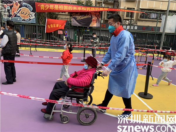 現(xiàn)場工作人員協(xié)助年長者做核酸檢測。