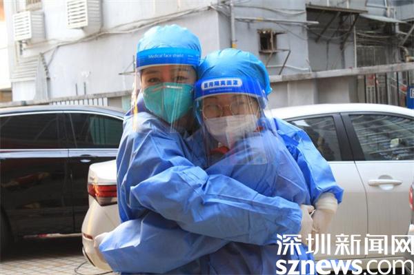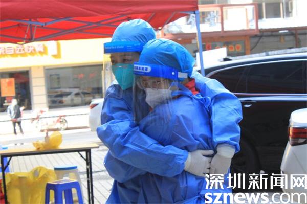 1月11日,深圳突然降溫,風(fēng)大天冷。北風(fēng)呼嘯中,羅湖區(qū)桂園街道老圍社區(qū)禧程酒店的臨時檢測點(diǎn)帳篷差點(diǎn)被掀翻。寒風(fēng)刺骨,社區(qū)工作人員和志愿者有條不紊地引導(dǎo)市民有序采樣。工作人員在“風(fēng)口浪尖”上站得久了,被吹得全身透涼,手指頭都冷僵了。瞬間,兩名志愿者緊緊擁抱在一起,相互取暖,以示鼓勵。隨后,又立刻回到各自崗位,投入緊張的工作中。