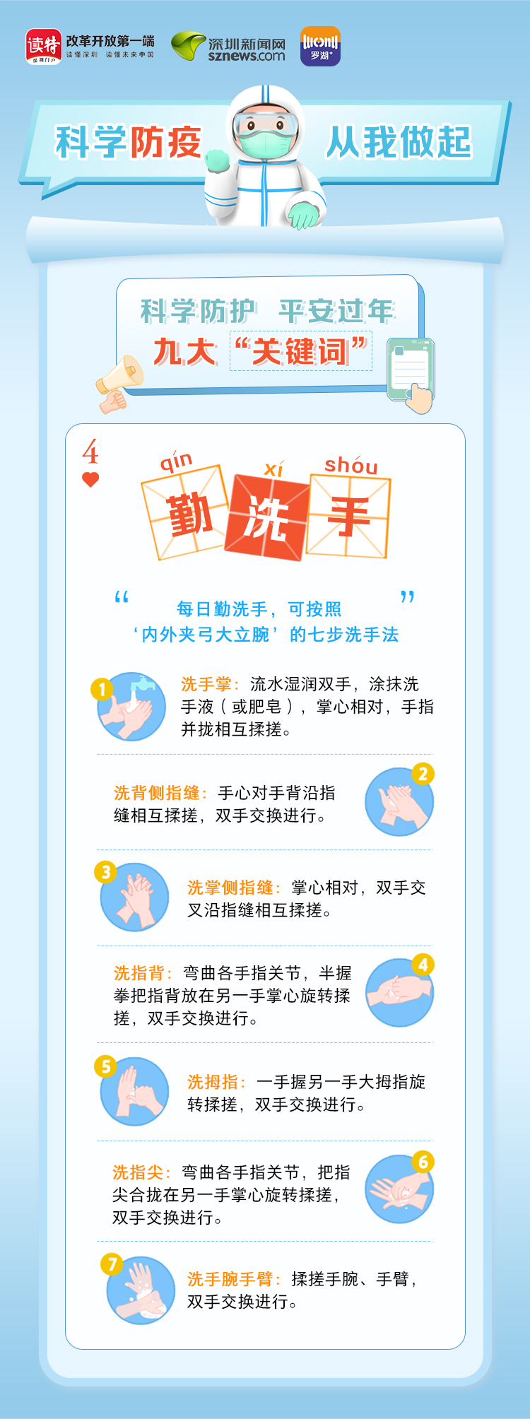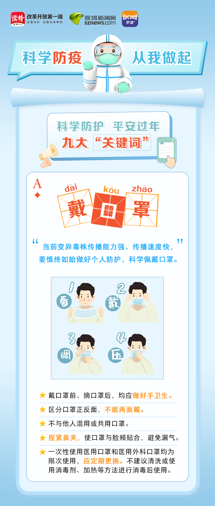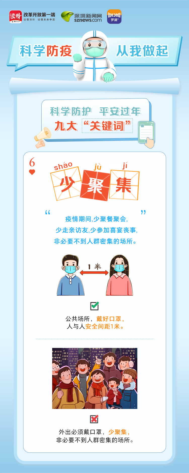 為更好地保護(hù)自己和他人的健康,度過一個(gè)祥和平安的春節(jié),請查收《科學(xué)防護(hù)平安過年九大“關(guān)鍵詞”》。在這場沒有硝煙的戰(zhàn)斗中,公安干警、醫(yī)護(hù)人員、社區(qū)工作者、志愿者始終堅(jiān)守在一線,齊心協(xié)力、眾志成城抗擊疫情。讓我們攜手并進(jìn),共同抗疫,采用科學(xué)有效的方式做好自身防護(hù),不僅對自己負(fù)責(zé),更是對家人負(fù)責(zé),對社會(huì)負(fù)責(zé)。