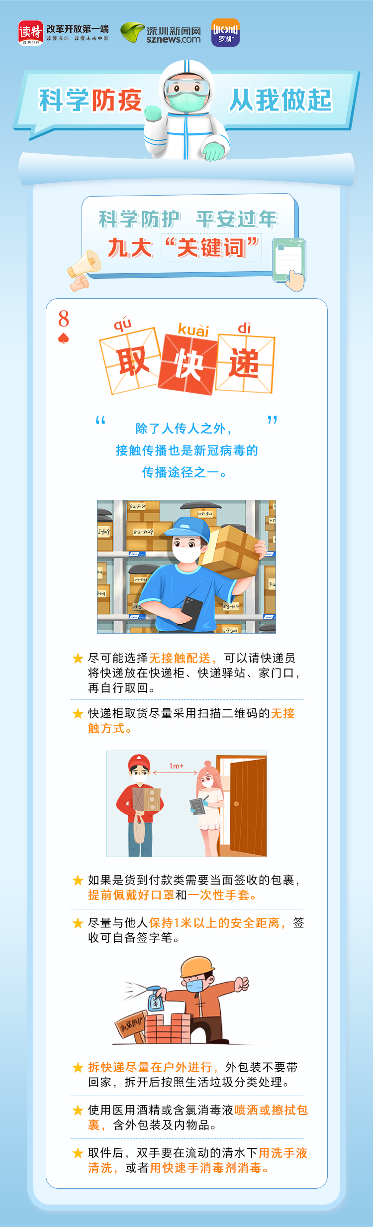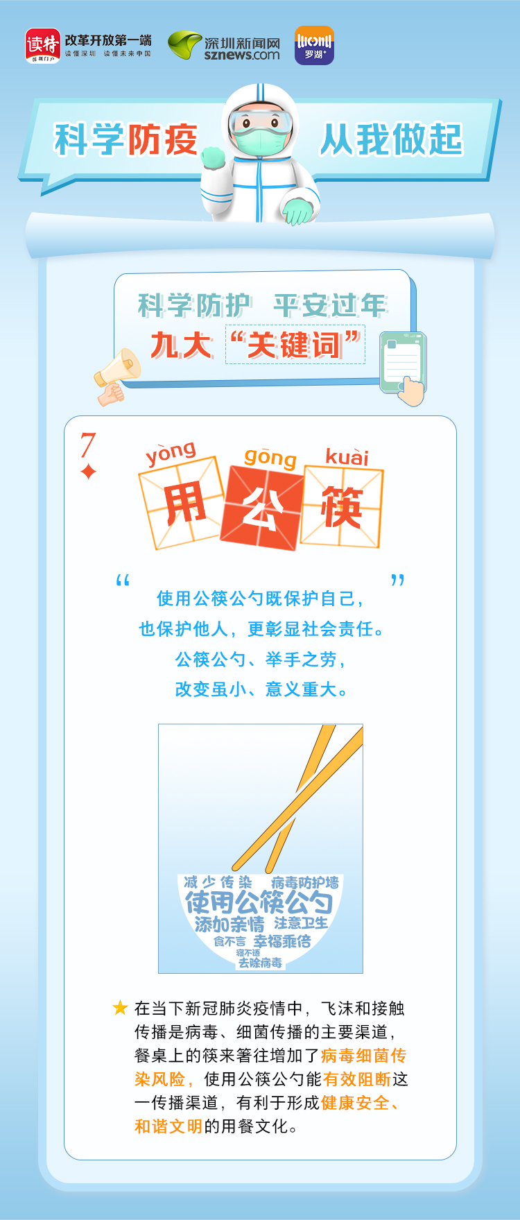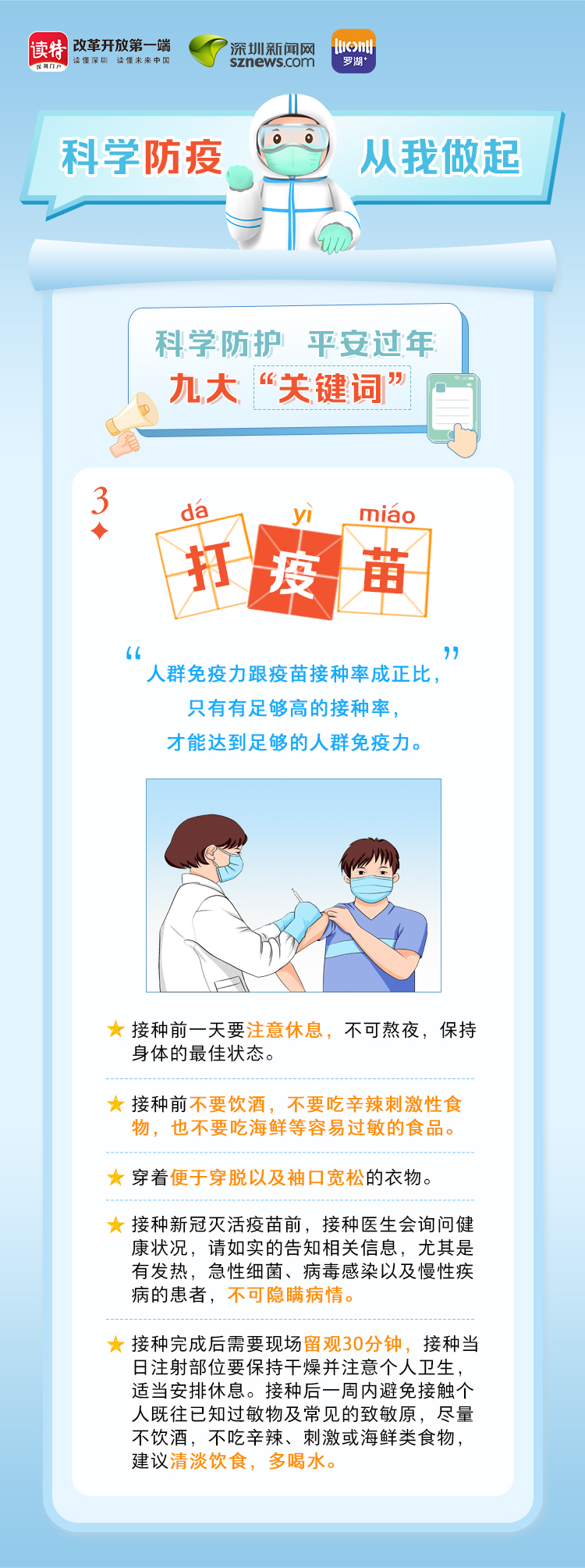 為更好地保護(hù)自己和他人的健康,度過一個(gè)祥和平安的春節(jié),請查收《科學(xué)防護(hù)平安過年九大“關(guān)鍵詞”》。在這場沒有硝煙的戰(zhàn)斗中,公安干警、醫(yī)護(hù)人員、社區(qū)工作者、志愿者始終堅(jiān)守在一線,齊心協(xié)力、眾志成城抗擊疫情。讓我們攜手并進(jìn),共同抗疫,采用科學(xué)有效的方式做好自身防護(hù),不僅對自己負(fù)責(zé),更是對家人負(fù)責(zé),對社會(huì)負(fù)責(zé)。