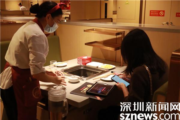 冬季是火鍋消費的旺季,在用餐高峰期,位于深圳市羅湖區(qū)這家連鎖火鍋店里,可見門口顯眼處貼著“半份菜 滿份愛”的海報,店內(nèi)還有光盤行動等標語,還有一名光盤行動倡導(dǎo)員在餐廳內(nèi)不時給消費者溫馨提示,倡導(dǎo)顧客適量點餐。