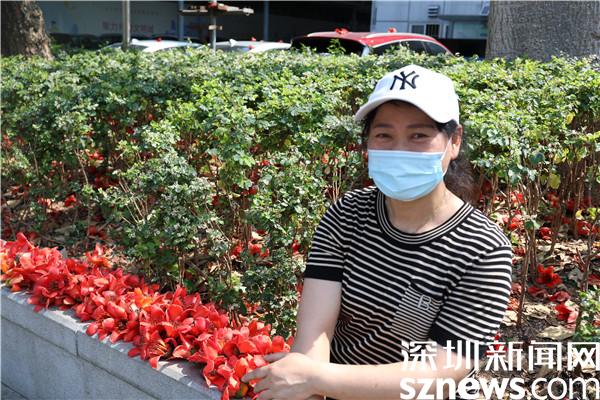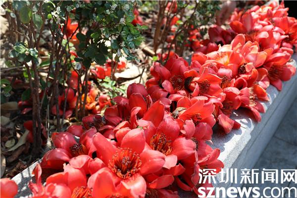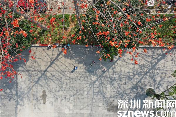 赤焰灼灼的木棉花開了,染紅了轄區(qū)半邊天際,與深圳藍相映成趣。一朵朵嫣紅的花兒垂?jié)M枝頭,沐浴著暖春的陽光綻放,也點綴著花下賞花的居民們。