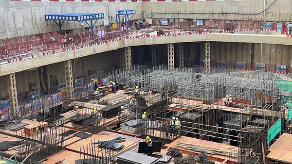 在施工現(xiàn)場,著裝整齊的施工人員正頭戴安全帽、佩戴口罩,有序地投入施工建設(shè)。挖掘機(jī)、裝載機(jī)不停運(yùn)轉(zhuǎn)、轟鳴作響,現(xiàn)場一派熱火朝天的建設(shè)景象。