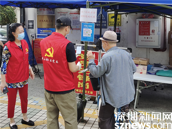 3月21日上午,在聚?;▓@黨員先鋒崗,老黨員張瑩和年輕黨員藍(lán)國(guó)亮在幫助居民掃場(chǎng)所碼。像這樣的新老黨員齊上陣,在畔山社區(qū)各黨支部還有很多,近日,轄區(qū)各核酸采樣點(diǎn)、小區(qū)出入口和城中村圍合卡點(diǎn),處處可見(jiàn)鮮紅的黨旗和忙碌的紅馬甲,他們用實(shí)際行動(dòng)影響并帶動(dòng)更多的熱心市民群眾參與社區(qū)服務(wù),為一線防疫工作“添磚加瓦”。