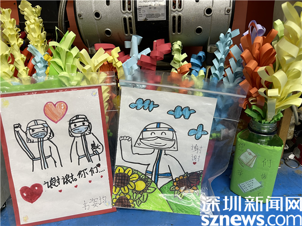 羅湖區(qū)蓮塘小學(xué)某班班長(zhǎng)見(jiàn)醫(yī)護(hù)人員和義工志愿者日夜操勞,不辭辛苦,號(hào)召全班同學(xué)為防疫人員“送溫暖”。有的同學(xué)親手制作五顏六色的精美手折紙花,還有些同學(xué)別出心裁的繪制了“感謝大白”賀卡,禮物制作完成后,全班同學(xué)分頭行動(dòng),將手折紙花送到各核酸采樣點(diǎn)醫(yī)護(hù)人員和志愿者手中?!拔覀儙筒簧鲜裁?,做些力所能及的事情,為大哥哥大姐姐送去感動(dòng)和力量,也是為抗疫做貢獻(xiàn)。”來(lái)自羅湖中醫(yī)院,在蓮塘村七巷小廣場(chǎng)支援的醫(yī)護(hù)人員們收到同學(xué)們送來(lái)的“禮物”非常開心,紛紛表示,雖然每天工作很辛苦,但能得到群眾尤其是孩子們的肯定十分幸福,禮物雖小,卻無(wú)比溫暖和感動(dòng)。