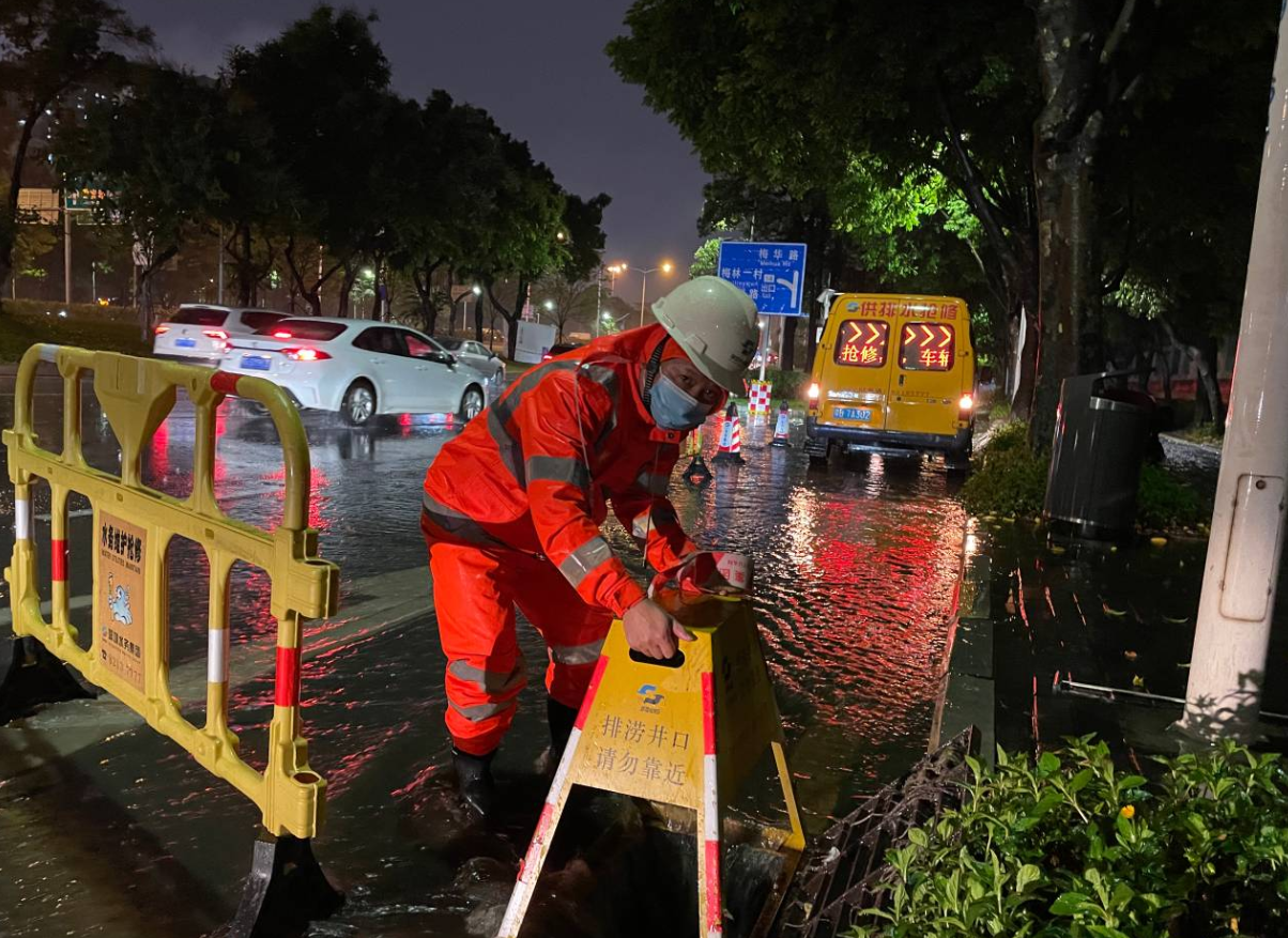 深圳環(huán)水集團(tuán)福田分公司員工堅(jiān)守在北環(huán)立交梅秀路口易淹點(diǎn),打開雨水篦子加速排水。(深圳新聞網(wǎng)記者 潘潤華 通訊員 陶柳)