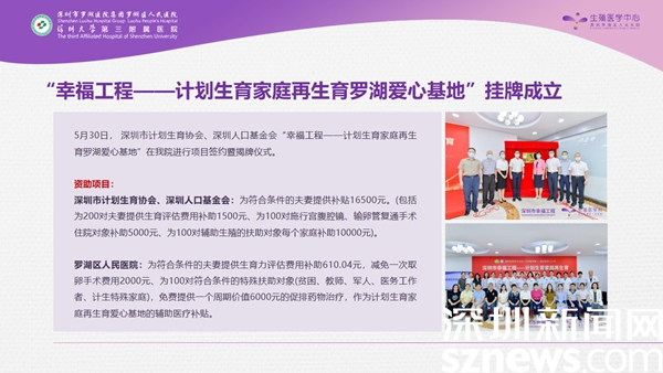 今年初,深圳市計(jì)劃生育協(xié)會、人口基金會就創(chuàng)建了一項(xiàng)“幸福工程”,旨在為計(jì)劃生育家庭再生育提供幫助。今年5月30日,第一個(gè)幸福工程基地就選擇坐落于羅湖醫(yī)院,項(xiàng)目為符合條件的夫妻提供總額高達(dá)16500元的醫(yī)療補(bǔ)貼,同時(shí),羅湖醫(yī)院還給予相應(yīng)的醫(yī)療減免,包括手術(shù)及藥品費(fèi)用的配套補(bǔ)貼。為居民再生育提供了很好的幫助,大大降低了經(jīng)濟(jì)壓力,讓更多的家庭愿意再生育。