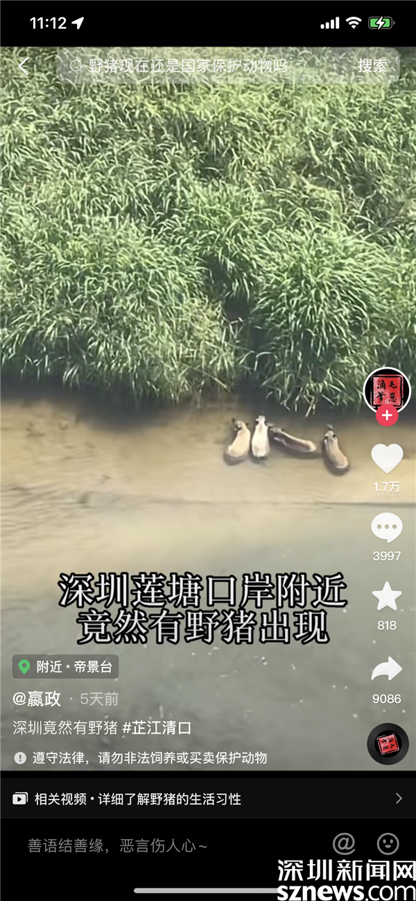 記者咨詢蓮塘街道和羅湖區(qū)城市管理綜合行政執(zhí)法局相關(guān)負責(zé)人表示,此次野豬出沒的地點的是在口岸對面,不屬于深圳管轄的范圍。此前,在仙湖植物園和梧桐山風(fēng)景區(qū)也頻現(xiàn)野豬身影。