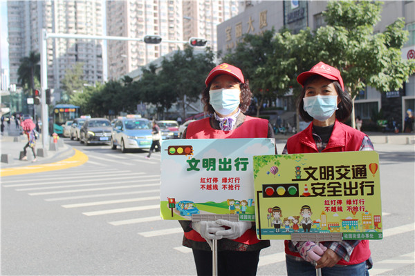 11月8日早晨,深圳明顯降溫,出行的市民紛紛穿上了厚衣御寒。身穿紅馬甲的義工,手舉“文明出行”的指示牌,在四面迎風(fēng)的路口執(zhí)勤,勸導(dǎo)市民文明出行,營造安全有序暢通的交通環(huán)境。