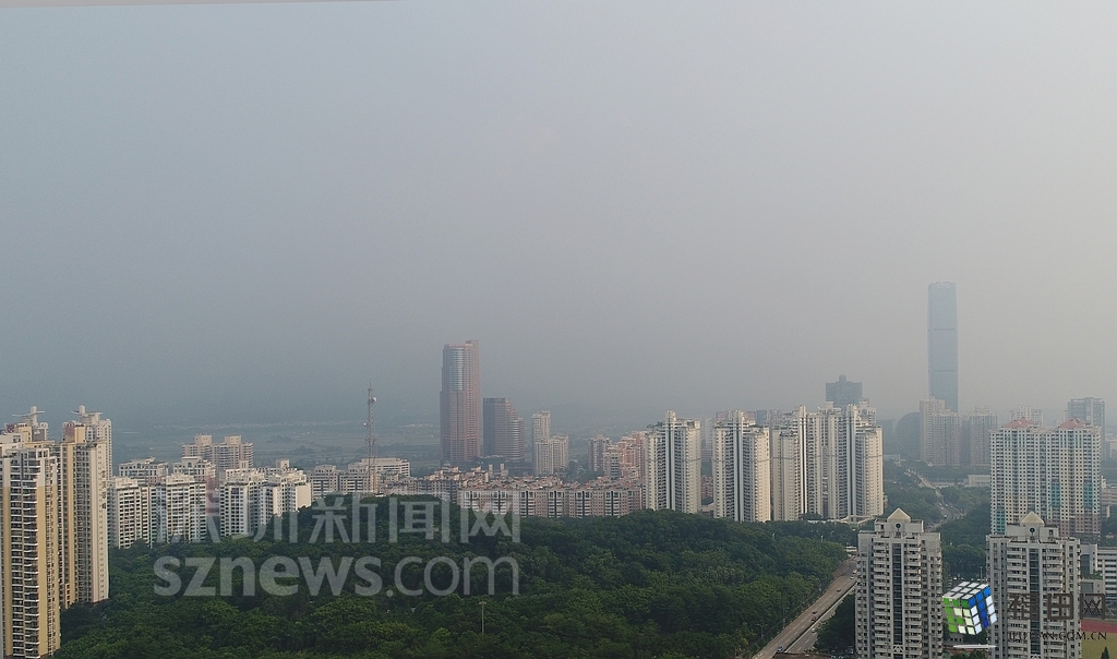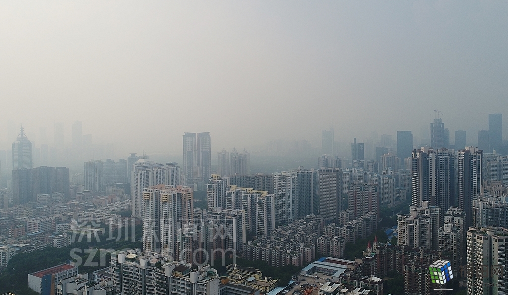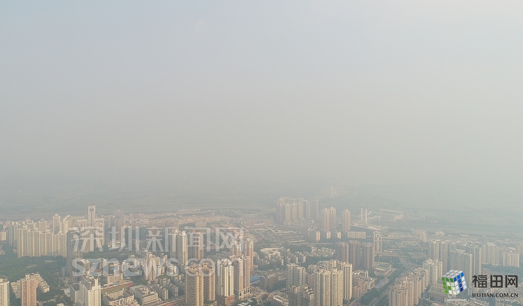 無人機(jī)在數(shù)百米高空俯瞰灰霾籠罩下的深圳中心區(qū),大半個城區(qū)都看不清楚。