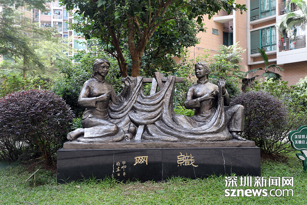位于社區(qū)內(nèi)的“織網(wǎng)”銅塑展示著漁民村改革開放前村民的生活日常
