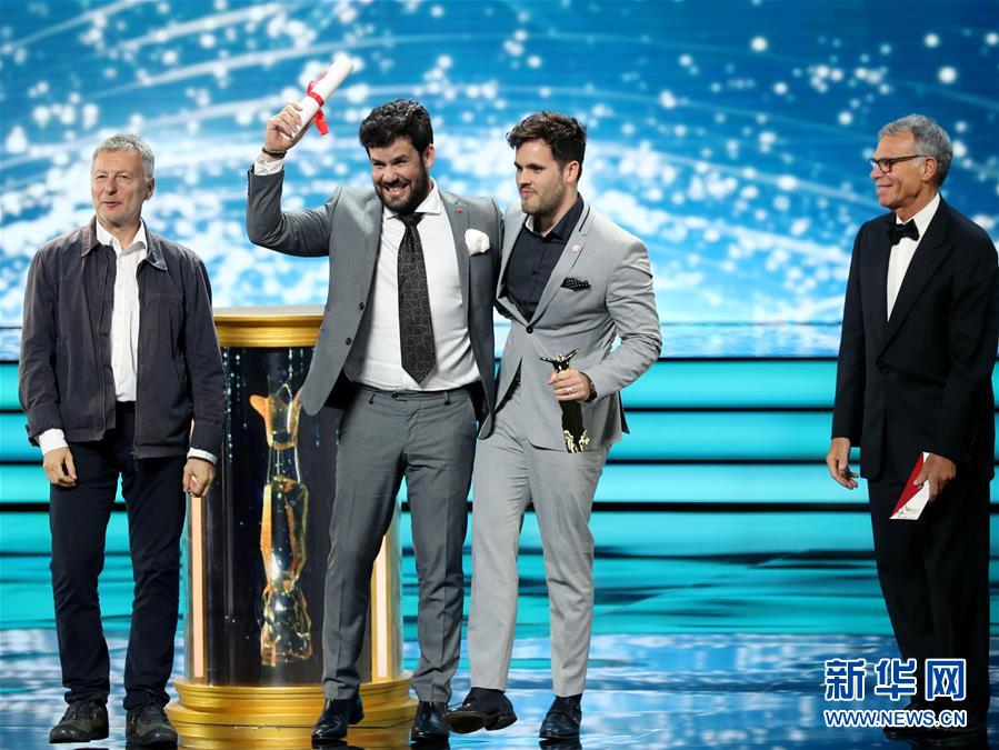 6月24日,加拿大導(dǎo)演兄弟塞巴斯蒂安·巴魯索(右三)與羅德里戈·巴魯索(右二)憑借電影《翻譯家》獲“最佳導(dǎo)演獎(jiǎng)”。當(dāng)日,第21屆上海國際電影節(jié)金爵獎(jiǎng)?lì)C獎(jiǎng)典禮在上海大劇院舉行。新華社記者 劉穎 攝