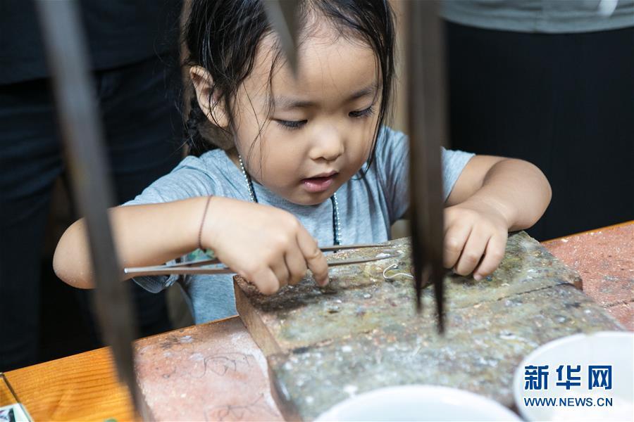 8月3日,來自西安的小朋友月白在龍?zhí)栥y飾體驗工作室中學習制作銀飾。