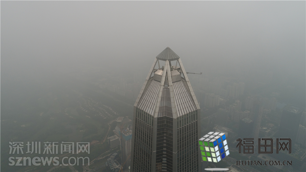 記者在福田中心區(qū)看到,大量的灰霾籠罩在城市上空,不少著名的地標(biāo)性高樓大廈玩起了“隱身術(shù)”。比如,平安金融中心大廈若隱若現(xiàn),在上午11時(shí)、下午4時(shí)等灰霾最嚴(yán)重時(shí)候甚至完全看不見。記者操作無人機(jī)航拍福田中心區(qū)的灰霾情況,在海拔500米左右的高空,無人機(jī)的視線就被灰霾完全擋住。距離不足一百米的平安金融中心都看不見任何蹤影。