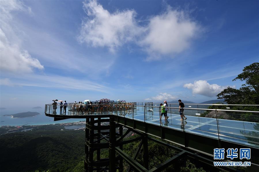 8月31日,游客在玻璃觀(guān)景平臺(tái)上參觀(guān)游覽。近日,位于海南省三亞市亞龍灣熱帶天堂森林公園的大佛石全海景玻璃棧道開(kāi)始正式營(yíng)業(yè)。凌空而建的玻璃棧道全長(zhǎng)400米,游客可將亞龍灣的美景盡收眼底。新華社記者郭程攝