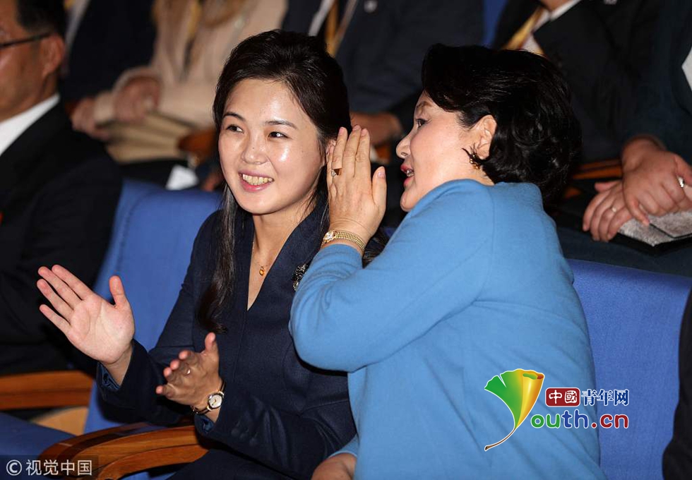當?shù)貢r間2018年9月18日,朝鮮平壤,韓國總統(tǒng)文在寅夫人金正淑在朝鮮國務(wù)委員會委員長金正恩夫人李雪主的陪同下參觀平壤金元均音樂大學。圖片作者:視覺中國