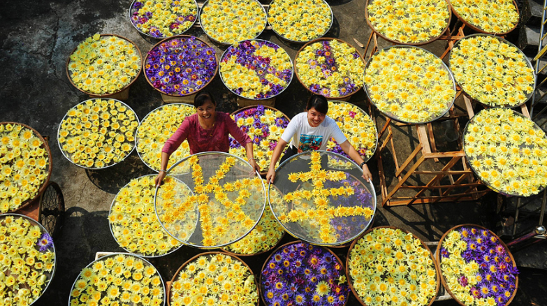 “祝福祖國”巨型花籃全面亮相