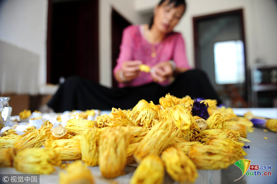 2018年9月23日,廣西柳州,柳北區(qū)石碑坪鎮(zhèn)下陶村的農(nóng)民覃向鮮在晾曬九品香蓮。圖片作者:陳健明