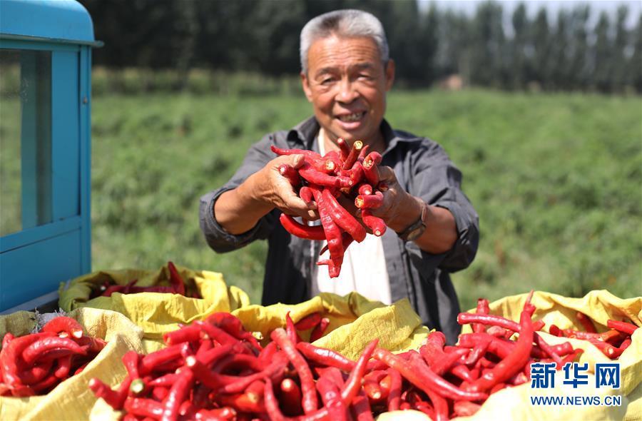 9月16日,阜城縣王集鄉(xiāng)南張莊村農(nóng)民在展示采摘的辣椒。近年來,河北省阜城縣王集鄉(xiāng)在推進(jìn)產(chǎn)業(yè)富民過程中,積極引導(dǎo)農(nóng)民調(diào)整農(nóng)業(yè)產(chǎn)業(yè)結(jié)構(gòu),按照品種特色化、種植規(guī)?;?、產(chǎn)銷一體化的“公司+基地+農(nóng)戶”的經(jīng)營(yíng)模式,鼓勵(lì)農(nóng)民發(fā)展特色辣椒種植,推行“訂單種植”模式,開辟出了一條農(nóng)民創(chuàng)收新路徑。目前,阜城縣王集鄉(xiāng)辣椒種植面積3100余畝,每畝年收益2500元以上,帶動(dòng)當(dāng)?shù)剞r(nóng)民實(shí)現(xiàn)增收。新華社記者朱旭東攝