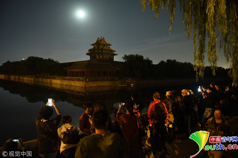 市民和攝影愛(ài)好者聚集故宮角樓下拍攝月亮。