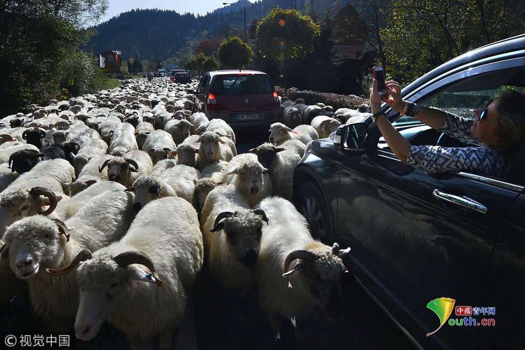 “綿羊大軍”行進(jìn)萬(wàn)米回農(nóng)場(chǎng)過(guò)冬 占據(jù)馬路吞沒(méi)車輛