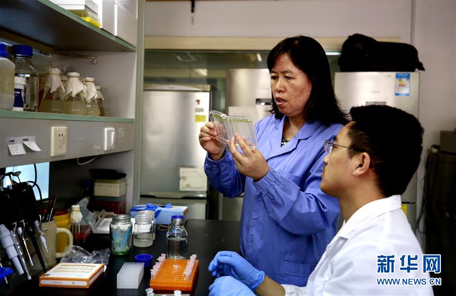 中科院植物生理生態(tài)研究所鄭慧瓊研究員(左)和學生在實驗室研究擬南芥(9月14日攝)。新華社記者張建松攝