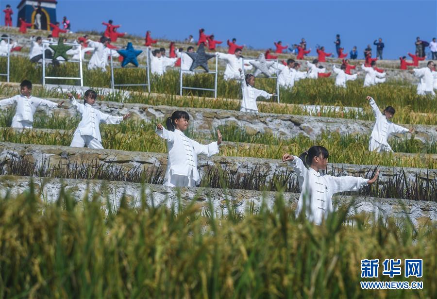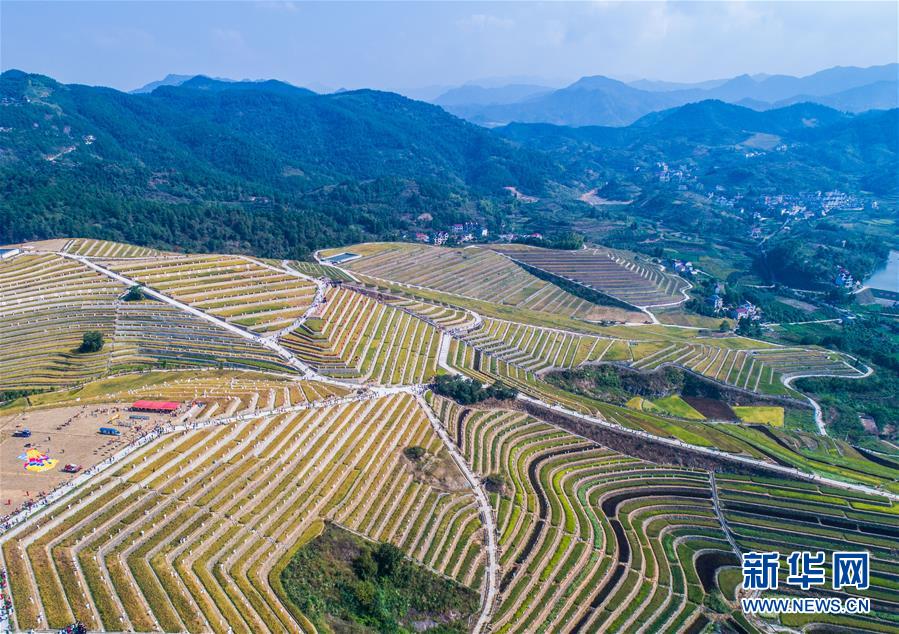 9月29日拍攝的秋日中的建德市大洋鎮(zhèn)高垣村梯田風景。當日,2000多名太極拳愛好者在浙江省建德市大洋鎮(zhèn)高垣村的千畝梯田上參加太極拳表演,吸引很多當?shù)厝撕陀慰颓皝碛^賞,助力當?shù)亟鹎飼r節(jié)鄉(xiāng)村旅游。近兩年來,大洋鎮(zhèn)充分利用土地整治后形成的千畝梯田打造農業(yè)觀光綜合體,發(fā)展綜合型農業(yè)觀光旅游,為鄉(xiāng)村振興注入新活力。新華社記者徐昱攝