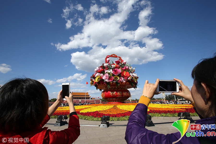 2018年9月29日,北京迎來高顏值好天氣,天安門廣場“祝福祖國”花壇在藍(lán)天白云映襯下壯美如畫。游客紛紛拿起手機(jī)、相機(jī)拍照留影充滿節(jié)日氣氛。