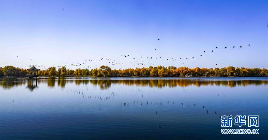在位于新疆巴音郭楞蒙古自治州輪臺縣的一處胡楊林里,一群鳥從水面上飛過(10月25日攝)。 新華社記者 趙戈 攝