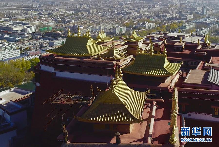 修繕后的布達拉宮金頂群(11月7日無人機拍攝)。