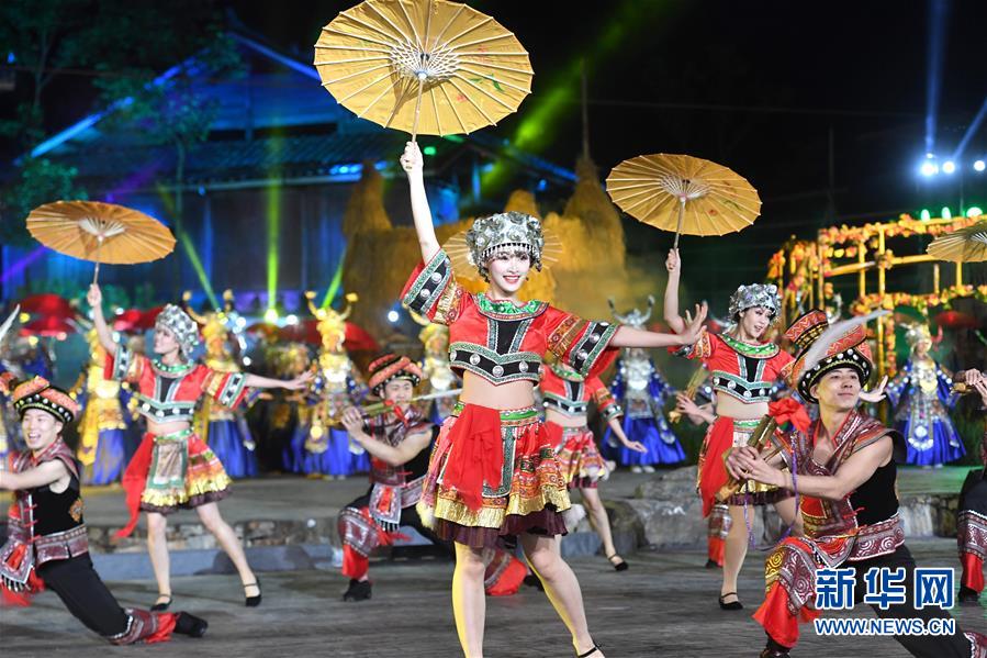 11月21日,演員表演歌舞《風(fēng)從苗山來》。 當(dāng)日,廣西柳州市第一屆旅游產(chǎn)業(yè)發(fā)展大會暨2018第十八屆中國·融水苗族蘆笙斗馬節(jié)開幕式晚會在融水苗族自治縣舉行。 新華社記者 周華 攝