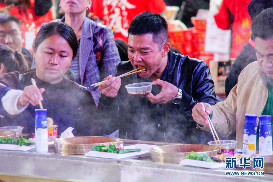 10月19日,食客們圍坐在一口特大火鍋前品嘗。 當(dāng)日,第十屆中國(guó)(重慶)火鍋美食文化節(jié)在重慶市江北區(qū)正式開幕。本屆火鍋美食文化節(jié)為期4天,以“麻辣happy城市節(jié)日”為主題,50000平方米的展區(qū)吸引了70余個(gè)火鍋品牌、300余家火鍋供應(yīng)鏈企業(yè)參展,萬人同燙火鍋的盛況在“火鍋之都”重慶再現(xiàn)。 新華社記者 劉潺 攝
