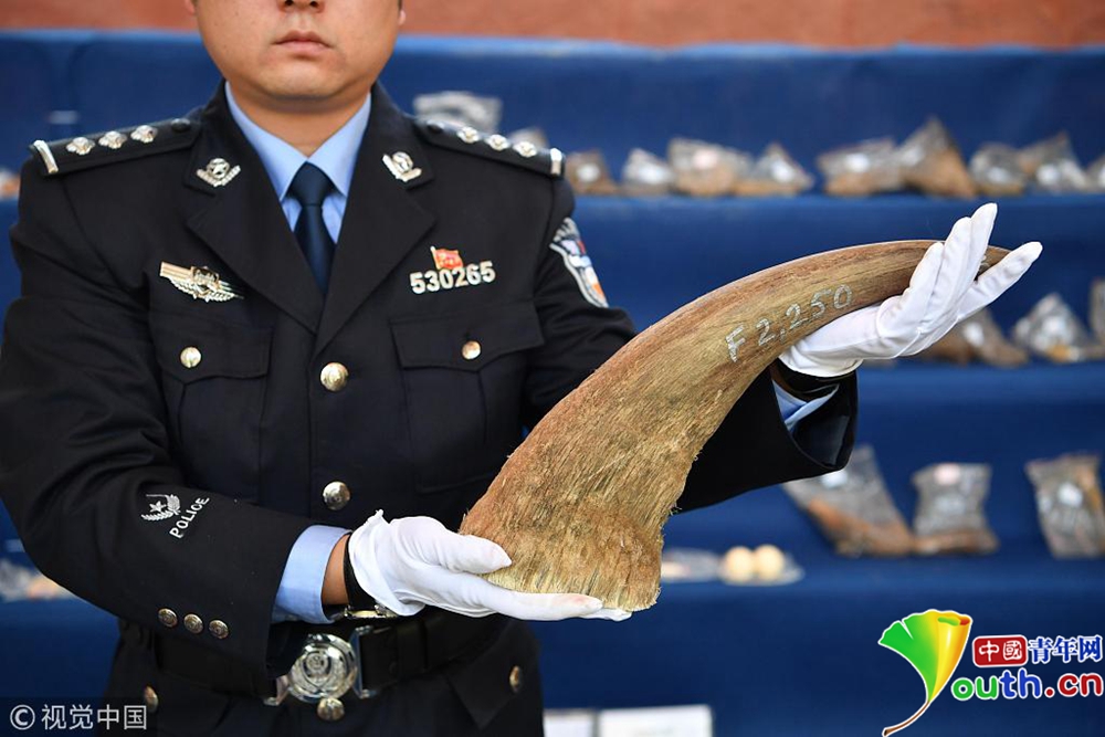 11月23日,現(xiàn)場展示警方查獲的野生動物制品。當日,昆明市森林公安局向媒體通報,破獲一系列特大非法收購出售珍貴瀕危野生動物及其制品案件。