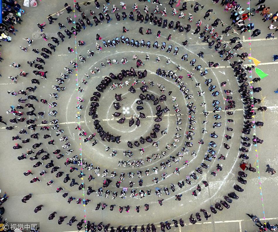 11月20日報道,2018年11月19日,侗族同胞在參加貴州省從江縣慶云鎮(zhèn)“凍魚節(jié)”踩歌堂。(無人機拍攝)2018年11月19日,貴州省從江縣慶云鎮(zhèn)境內(nèi)的石姓侗族同胞迎來傳統(tǒng)一年一度的“凍魚節(jié)”,當?shù)囟弊逋碇?jié)日盛裝舉行祭薩、踩歌堂、賽侗歌,慶祝豐收,祈福來年風調(diào)雨順,五谷豐登。