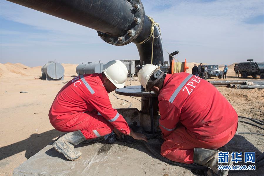 11月21日,在埃及明亞省,中國(guó)中曼石油公司的工人在鉆井現(xiàn)場(chǎng)作業(yè)。 2017年,中國(guó)中曼石油公司與阿聯(lián)酋海灣集團(tuán)簽訂合同,為該集團(tuán)在埃及沙漠中的大型農(nóng)業(yè)項(xiàng)目鉆探300口水井。根據(jù)合同,中曼石油將先期完成30口井的試鉆探,剩余水井將以每月7口的速度交付。目前有超過200名工人在鉆井現(xiàn)場(chǎng)作業(yè),大部分是埃及本地人。 新華社記者李碧念攝