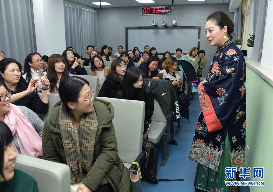 11月30日,畢紅(右一)在課堂上身著傳統(tǒng)服裝與師生們互動。 新華社記者李賀攝